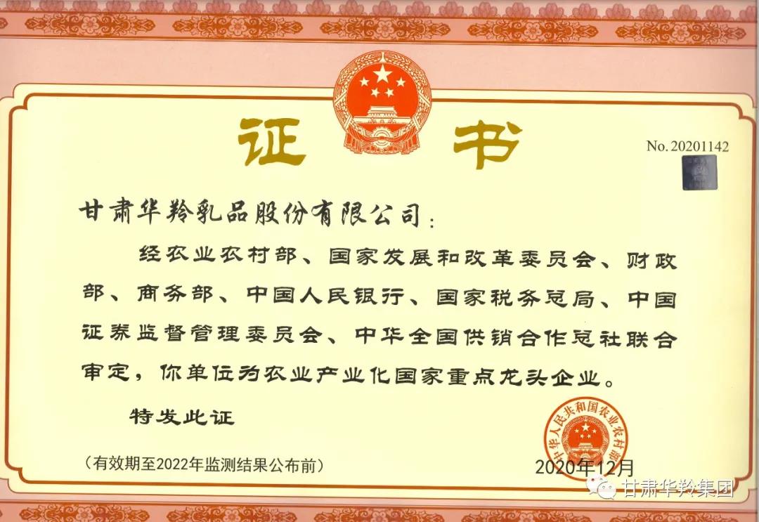 日前,《農業農村部關于公布第九次監測合格農業產業化國家重點龍頭企業名單的通知》發布,甘肅華羚乳品股份有限公司位列其中。自2004年被評為農業產業化國家重點龍頭企業以來,公司已連續17年通過該監測。